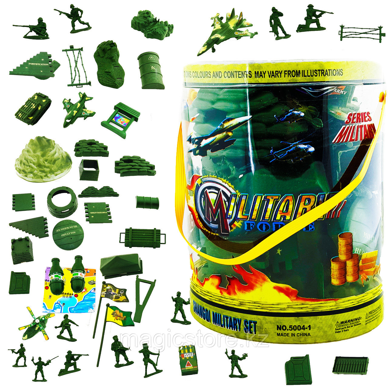 В набор входит зd гора, военная техника, карта, солдаты, объемные ограждения, таблички, флажки.