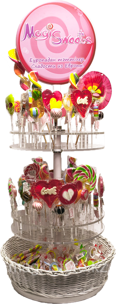 В "Стойку для леденцов настольную диаметром 30 см." входит: Корзина (ротанг) d 300 mm / h 90 mm + 2 полки круглые (акрил) d 300 mm / h 35 mm.
